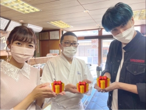 和菓子作り体験をしてくださった豊成アナウンサーと、笑って泣けるコミックバンド 四星球の北島康雄さん